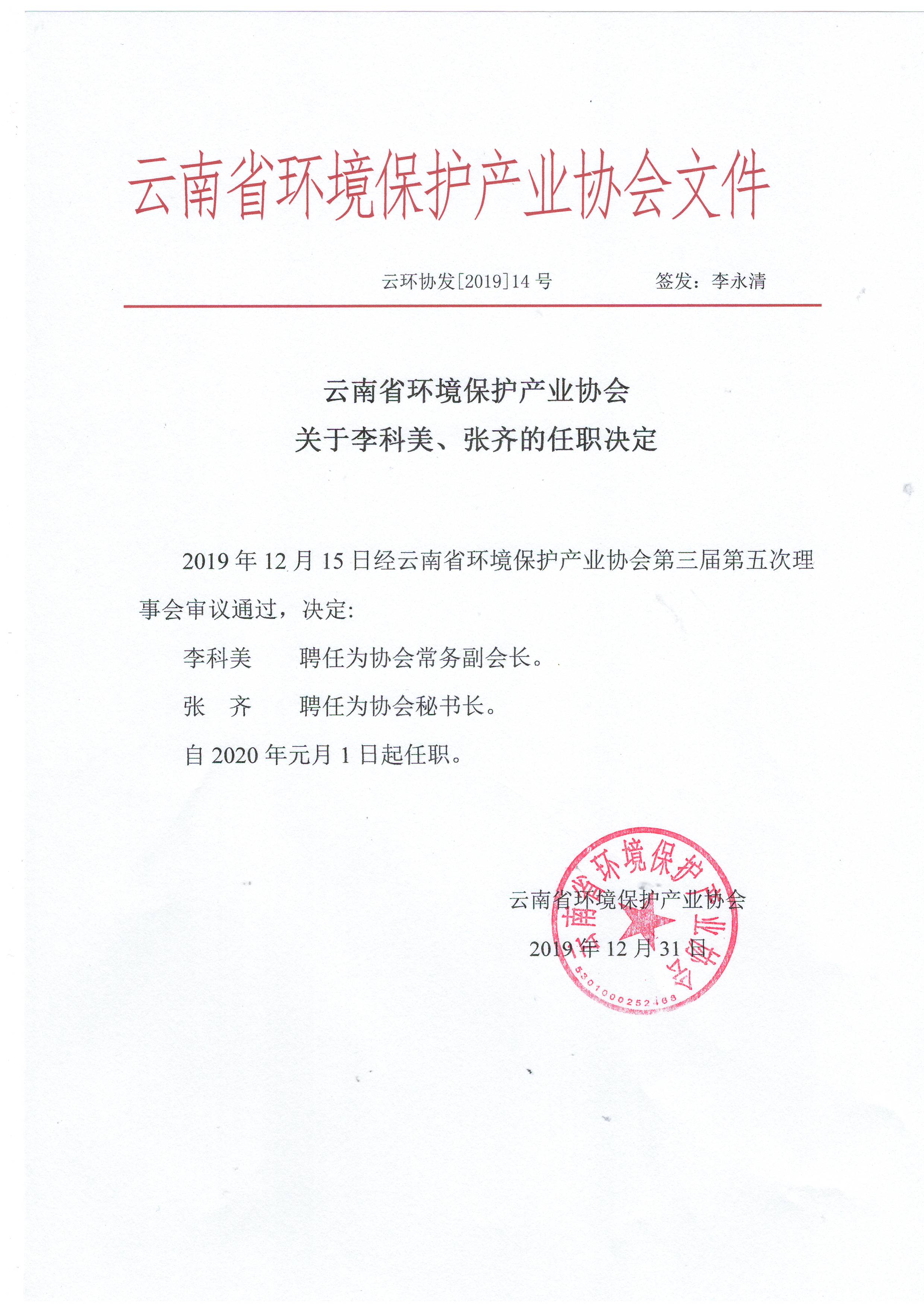 云南省環(huán)境保護(hù)產(chǎn)業(yè)協(xié)會關(guān)于李科美、張齊的任職決定