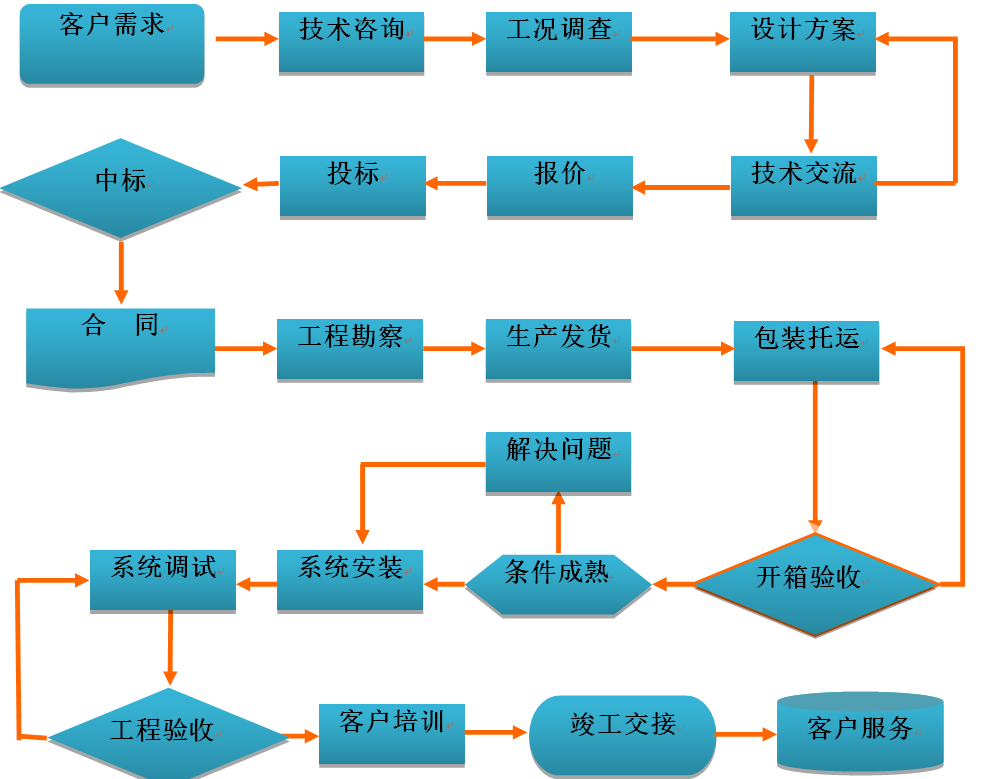 我公司經(jīng)過多年的經(jīng)驗(yàn)總結(jié),形成了一套完整合理的客戶服務(wù)流程體系,服務(wù)流程包括銷售服務(wù)、系統(tǒng)設(shè)計、采購、生產(chǎn)、檢驗(yàn)、工程實(shí)施、投運(yùn)、維護(hù)等各個環(huán)節(jié)。公司對相關(guān)的服務(wù)流程持續(xù)的完善和優(yōu)化,使系統(tǒng)服務(wù)的質(zhì)量管理更加標(biāo)準(zhǔn)化、程序化、規(guī)范化,為系統(tǒng)服務(wù)工作奠定了扎實(shí)的基礎(chǔ)。